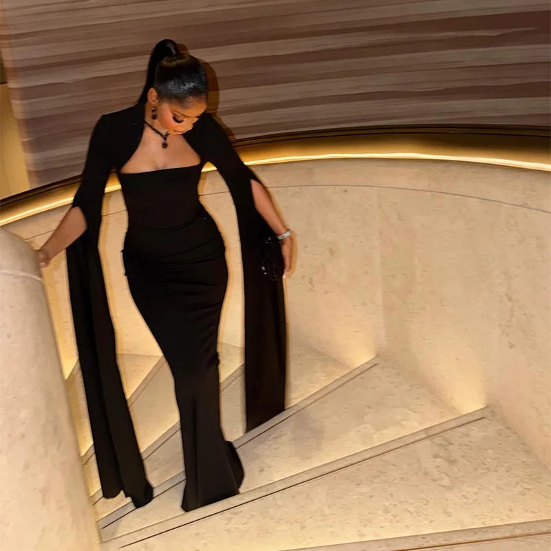 Black Scuba Crepe Cape Sleeve Midi Dress